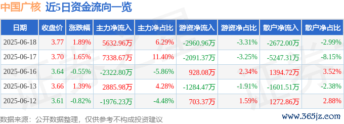 本站消息,截至2025年6月18日收盘,中国广核(003816)报收于3.77元,上涨1.89%,换手率0.61%诚信双盈,成交量238.59万手,成交额8.95亿元。